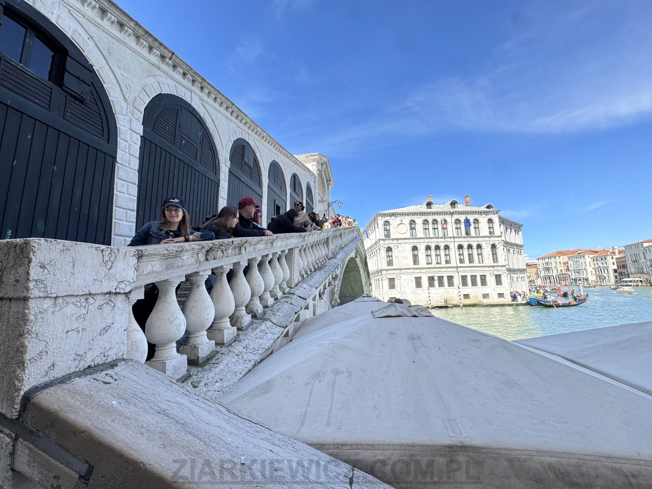 Po drodze nie mogliśmy zatrzymać się oczywiście przy słynnym moście Ponte di Rialto. To najstarszy z czterech mostów przecinających Canal Grande w Wenecji, łączący dzielnice San Marco i San Polo. Powstał jako prosty most łodziowy w 1170 roku i był kilkakrotnie przebudowywany, aż do obecnej kamiennej konstrukcji ukończonej w 1591 roku.