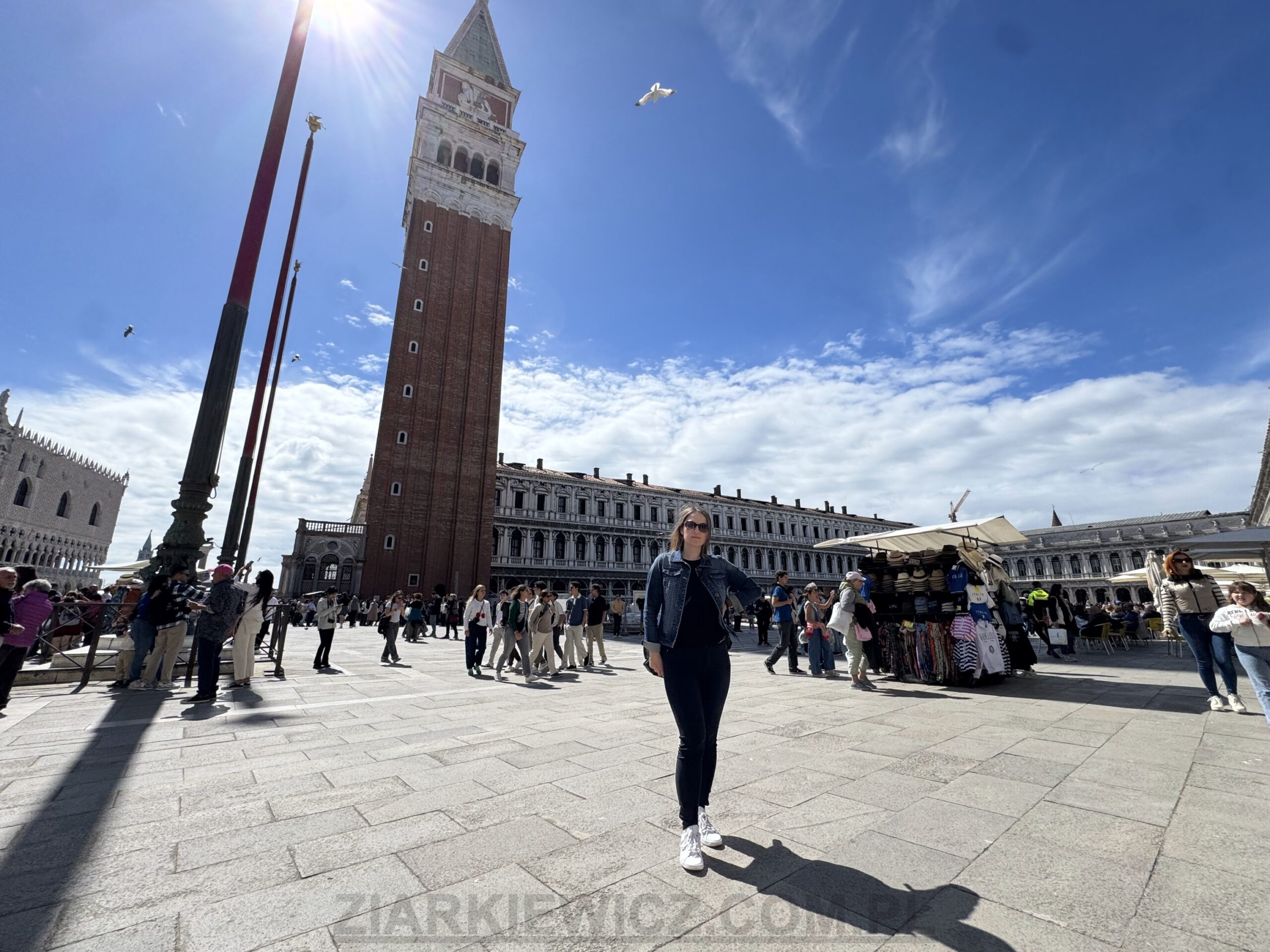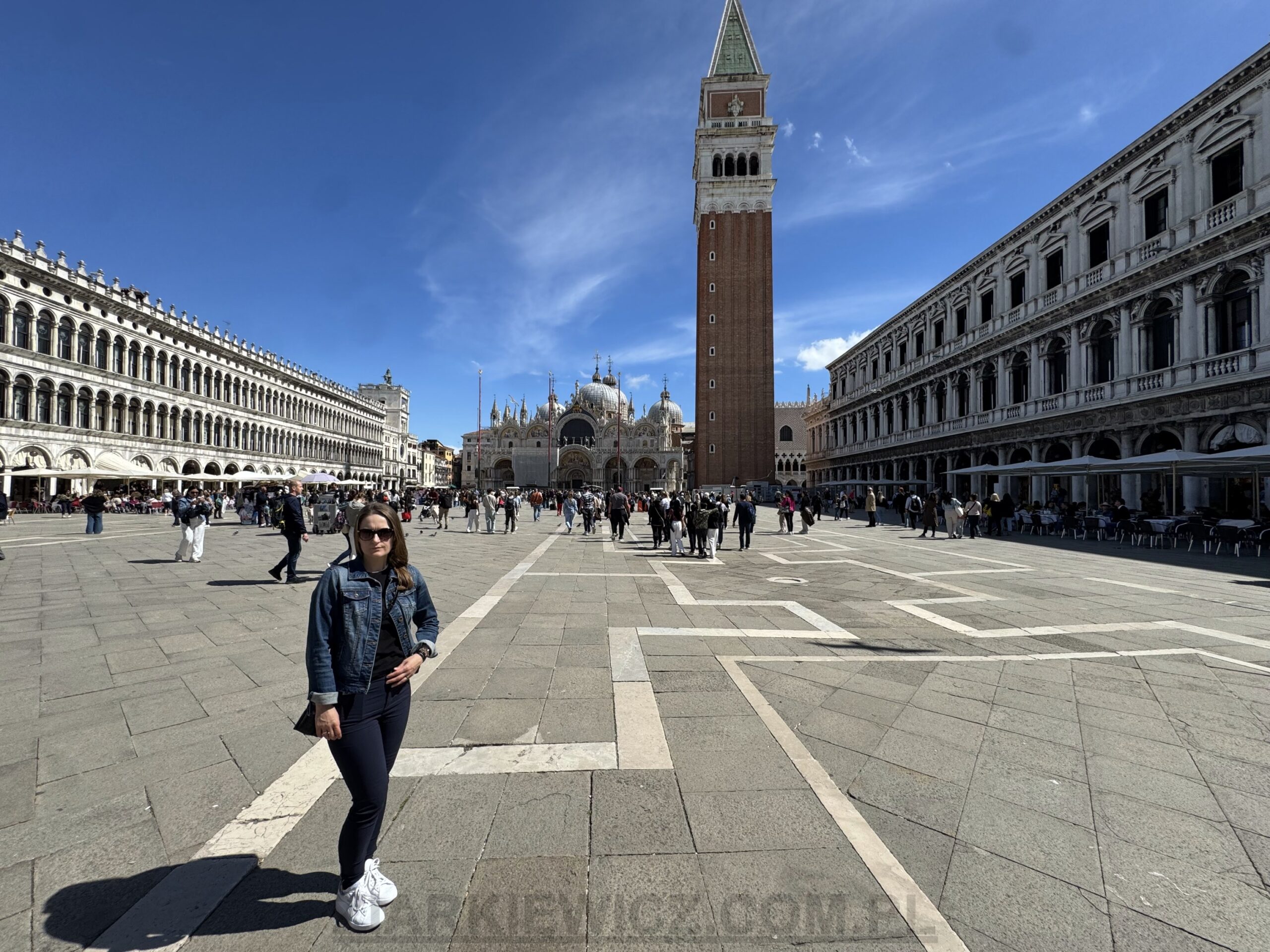 Dzwonnica św. Marka (wł. Campanile di San Marco) widoczna na zdjęciu poniżej, należy do największych symboli Wenecji i jednocześnie do najpopularniejszych punktów widokowych miasta. Widząc jej wysokość moglibyśmy obawiać się o swoją kondycję podczas wchodzenia, ale na szczęście na górę wjeżdża się windą.