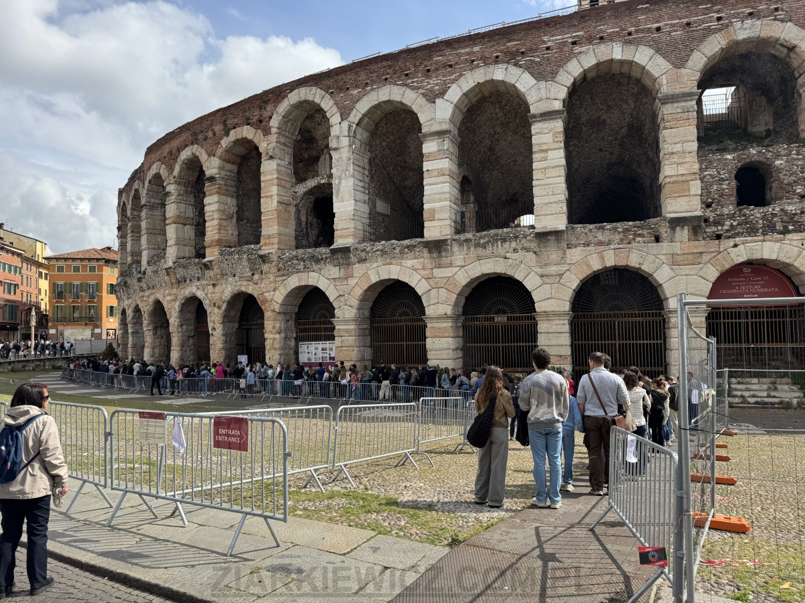 W ciągu dnia weroński amfiteatr udostępniony jest do zwiedzania. Nie znajdziemy w nim jednak żadnych wystaw czy eksponatów, a jedynie podstawowe tablice opisowe. Po zakupie biletu możemy po prostu przejść się korytarzami, stanąć na arenie czy pospacerować po trybunach. Bilet na arenę jest dość drogi i kosztuje 12€. Zwiedzania jest na jakieś 30 minut, ale jak widzicie, sama kolejka do kas potrafi zatrzymać nas na dłużej.