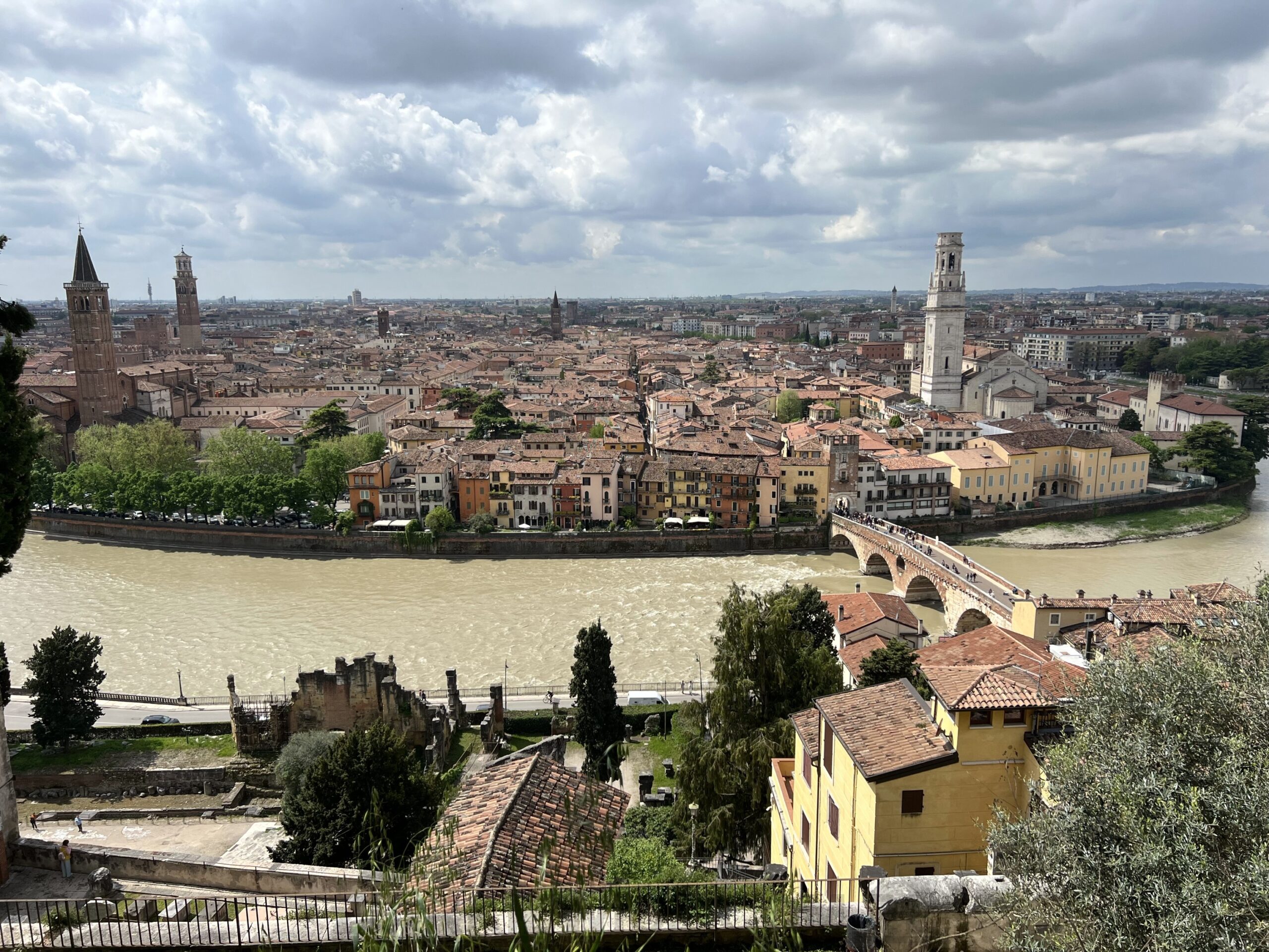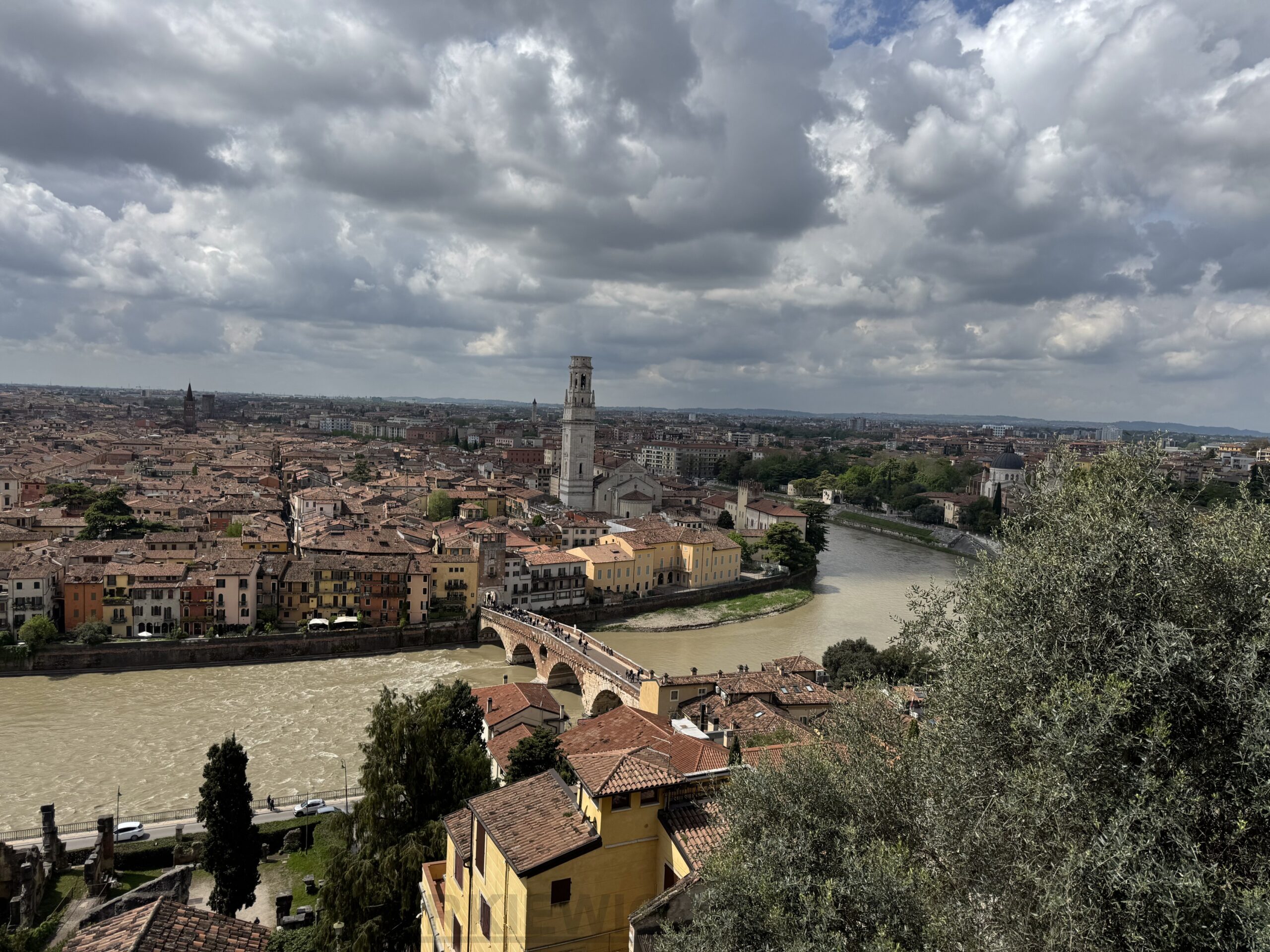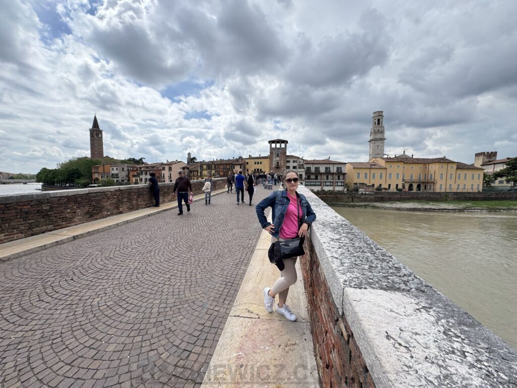 Na dole przechodzimy też przez Ponte Pietra, nazywany Kamiennym Mostem. To jeden z dwóch zabytkowych mostów z czasów rzymskich, jakie zachowały się w Weronie. Został zbudowany w I wieku p.n.e.