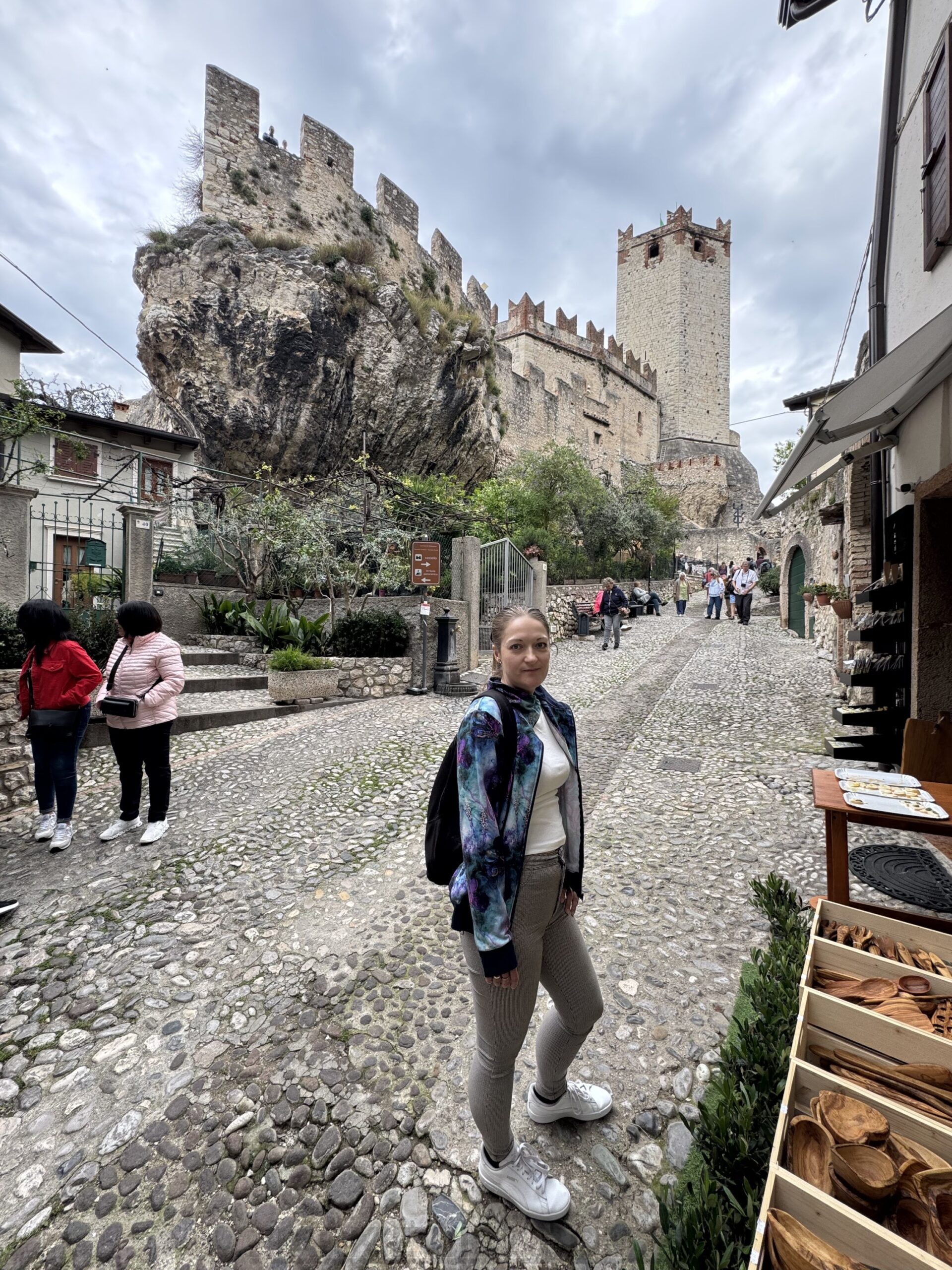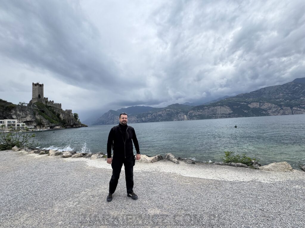 Zatrzymaliśmy się w miejscowości Malcesine – tuż nad brzegiem jeziora. Jedną z atrakcji tej miejscowości jest zamek Scaligerich w Malcesine (wł. Castello Scaligero) – zamek obronny, na wschodnim brzegu jeziora Garda. Wznosi się na niewysokim, skalistym przylądku wychodzącym w wody jeziora Garda.